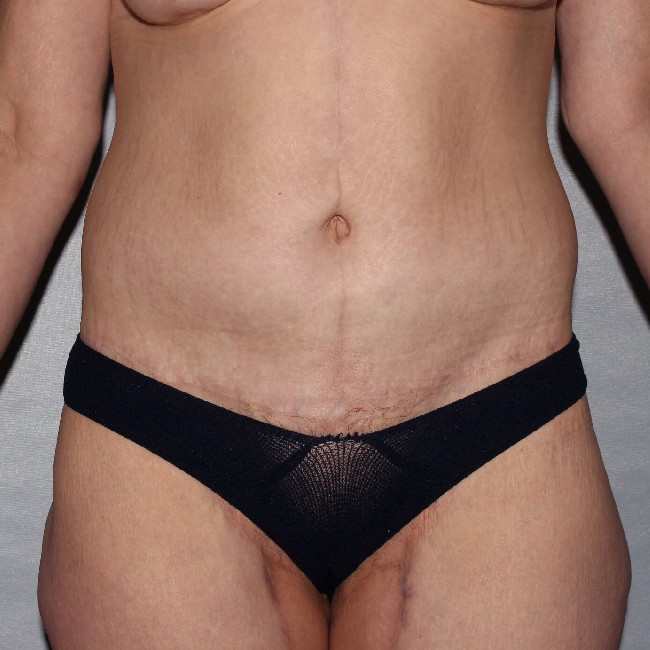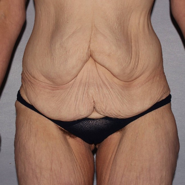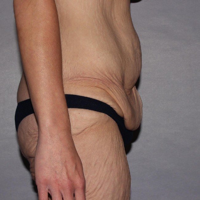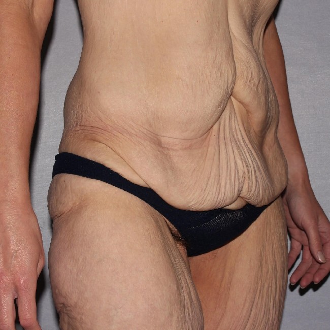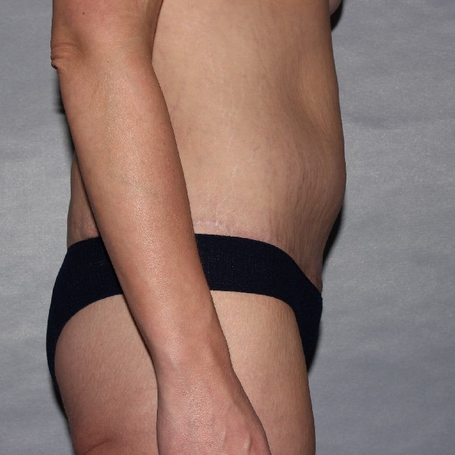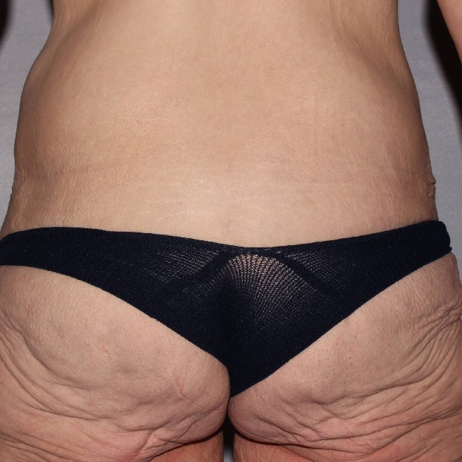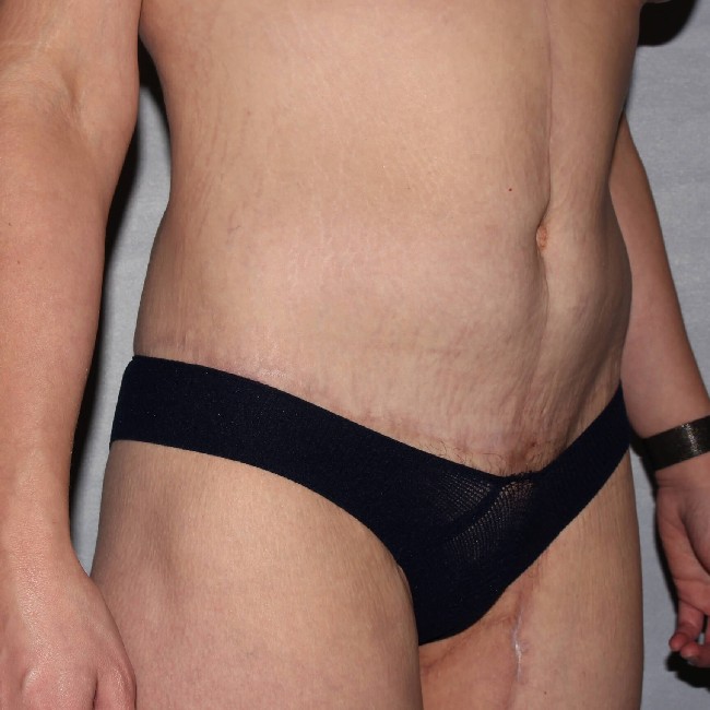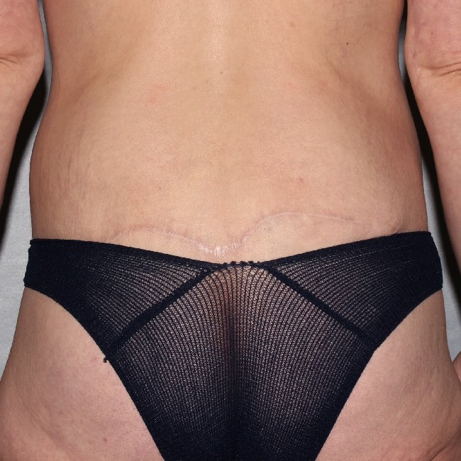 She underwent a preliminary procedure, which was a circumferential abdominoplasty or body lift done with a Fleur-de-lis technique, which involves the removal of central abdominal skin resulting in a midline vertical scar. She did very well with the procedure and had marked improvements in the appearance of her abdomen and flanks, and buttocks with the removal of excess skin and fatty tissue from her lower abdomen and back.