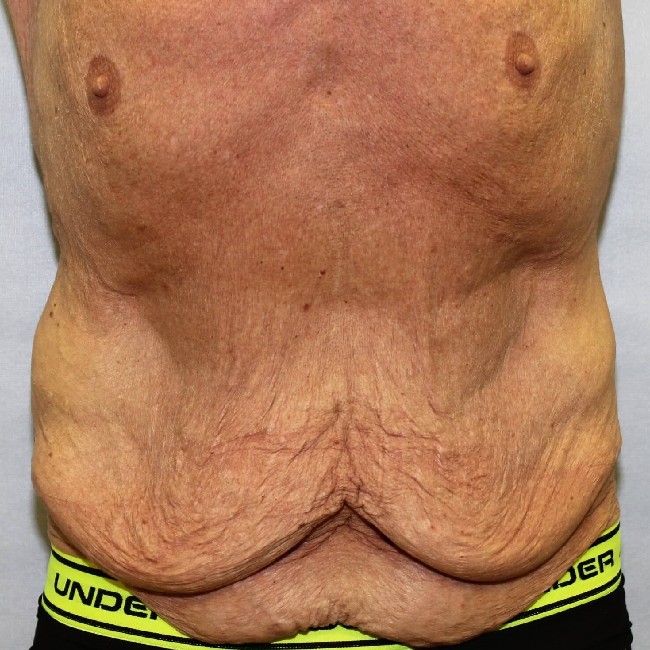 This is a 56-year-old gentleman who had prior bariatric surgery with over 100 pounds of weight loss. Unfortunately, he also had to have spinal fusion and had atrophy of his lower trunk. His excessive loose skin of his abdomen draped down below his pubic area, and he desired removal. He did have a host of underlying health problems but was considered a moderate risk candidate for abdominoplasty.