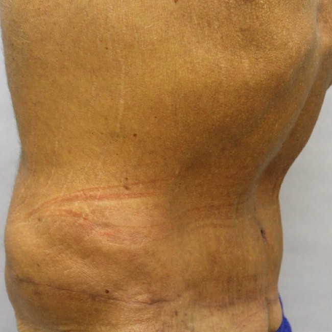 He has a very flat abdomen and flank area now. Post-bariatric body contouring has to be tailored for each individual. This patient had primarily excess skin and virtually no fat, and his procedure was entirely done with excisional technique with no need for liposuction. The loose skin of his abdomen no longer causes him problems.