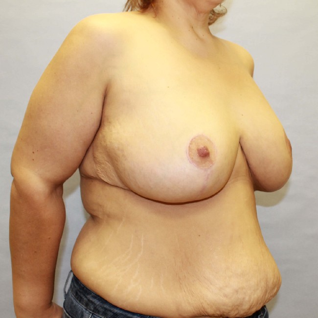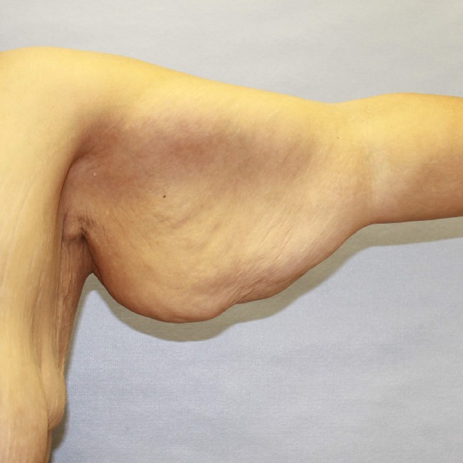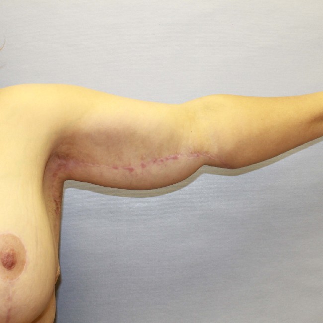 She had a Wise pattern or anchor scar on her breast because of so much excess skin. Only about 150 grams of skin and breast were removed from each side. Her brachioplasty was extended into her axilla to treat loose skin located there.
