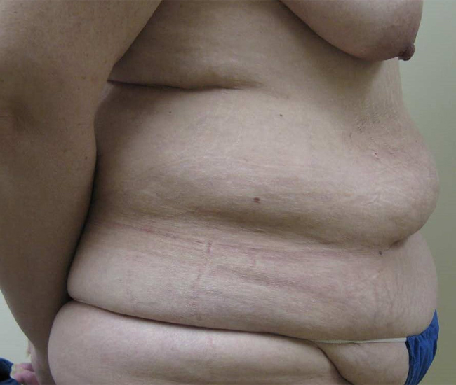 This 39-year-old woman used to weigh over 400 lbs. She had a gastric bypass and lost 180 pounds. She had loose skin and excess fat on her lower abdomen and flanks.