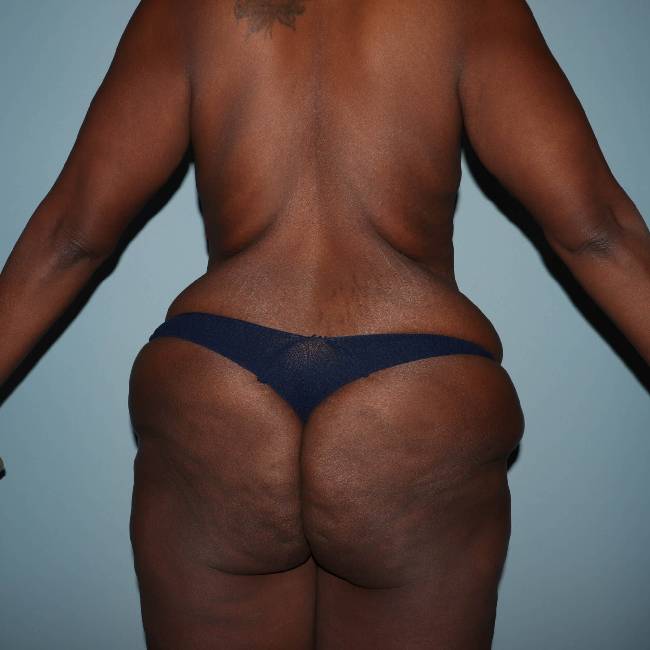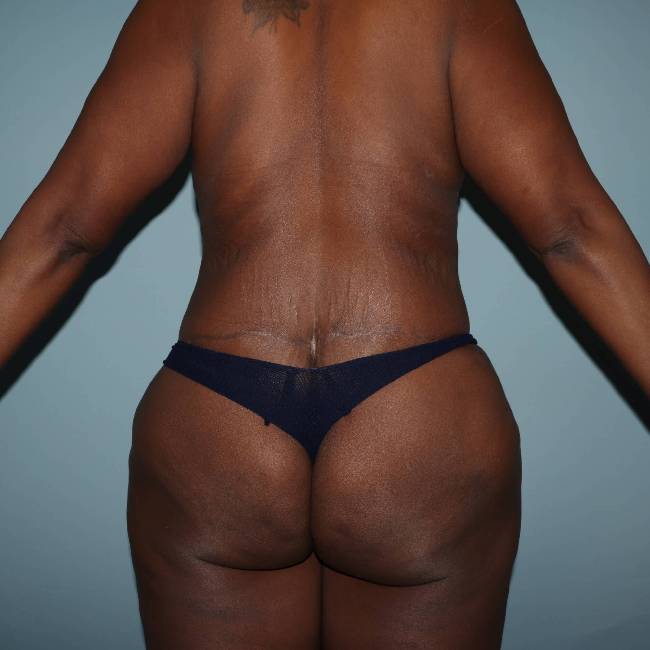 She underwent a circumferential abdominoplasty or body lift. She had a small amount of liposuction performed. Patients with this amount of weight loss frequently do not have a lot of fatty excess, mostly skin and loose fat mostly amenable to excisional approaches rather than liposuction. Her results were dramatic with significant improvement of the pannus, hip area, and buttocks. Dr. Lyle will do these procedures in his office-based, fully accredited outpatient ambulatory surgery center, provided that the body mass index is 30 or less. On some occasions, he will perform surgery on patients with a higher BMI at Rex Hospital, but generally restricts his surgery to patients with a body mass index of 35 or less.