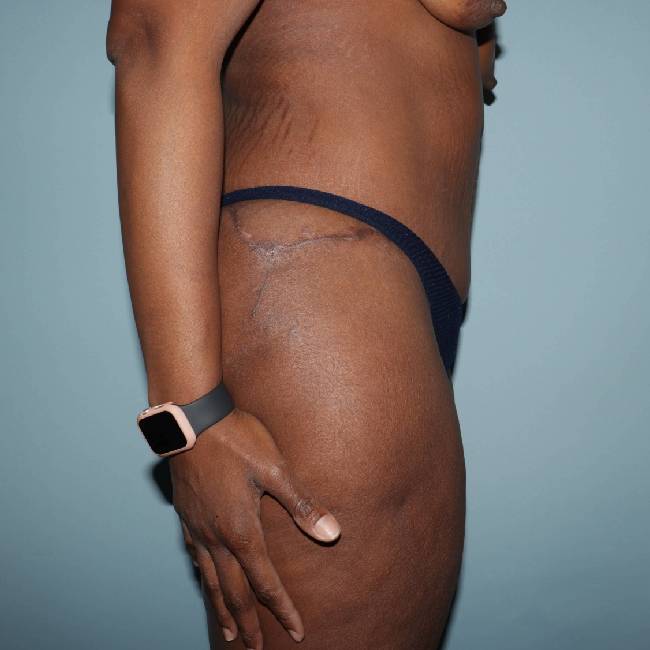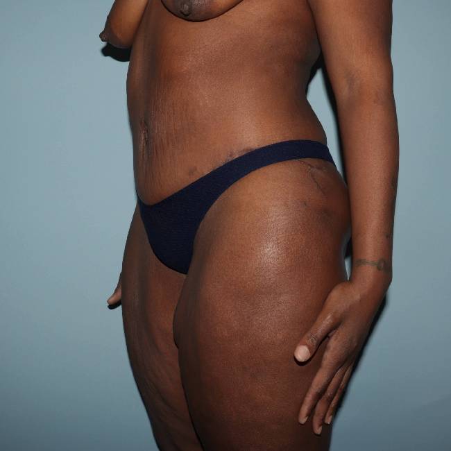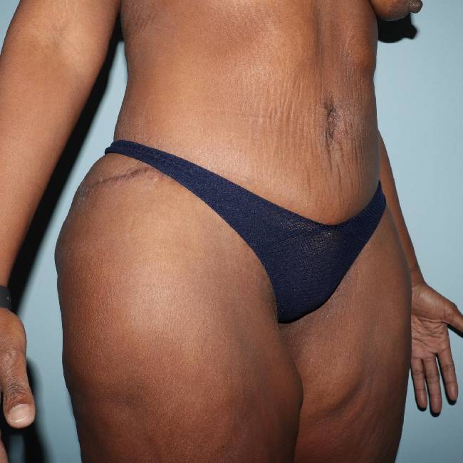 The patient was very pleased with her results and, in fact, is planning on having some breast lifting done. Many patients with this amount of weight loss will require several separate procedures to address areas of concern, such as the thighs, arms, and breasts.