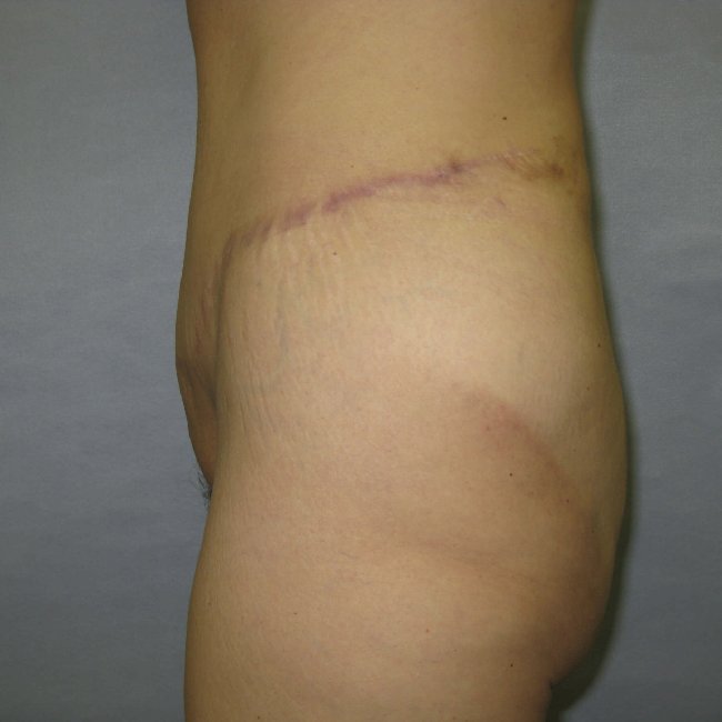 She had an extended high-tension abdominoplasty to remove the excess skin and fat, repair her diastasis, and also help raise and tighten her thighs a bit.