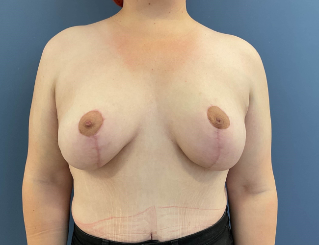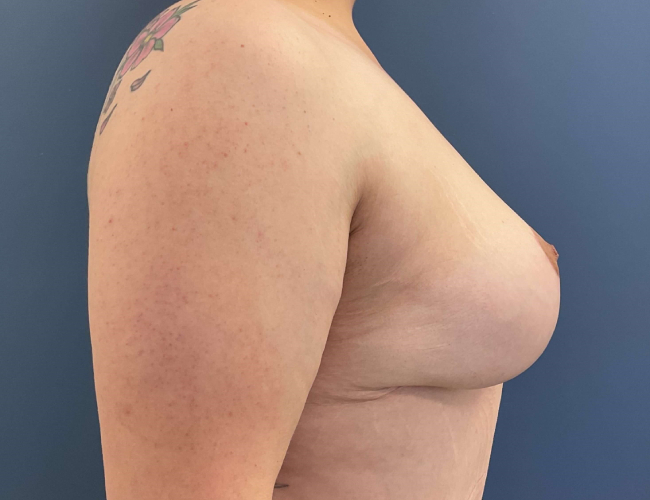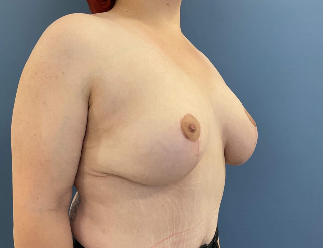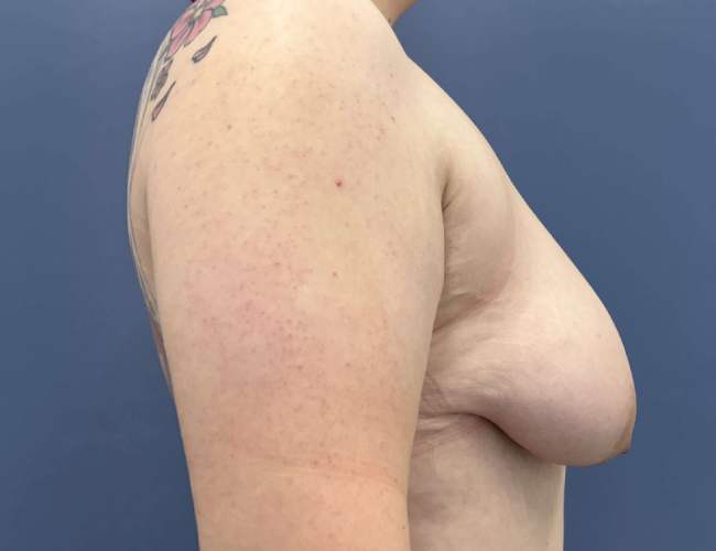 Dr. Lyle chose a vertical mastopexy technique often called a lollipop lift or circum-vertical lift. This procedure differs from the standard inverted T or anchor pattern type incision, which is usually necessary for patients with massive weight loss. There is less incision, usually just a vertical scar and perhaps a short lateral scar. Each case is different, however, and being familiar with a variety of techniques is important when deciding the best procedure to improve the breast appearance. Dr. Lyle also performed some Vaser-assisted liposuction of her axillary area and did some revisions of the previous plastic surgeon’s abdominoplasty.
