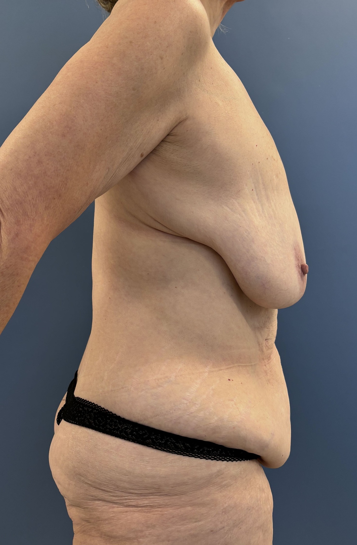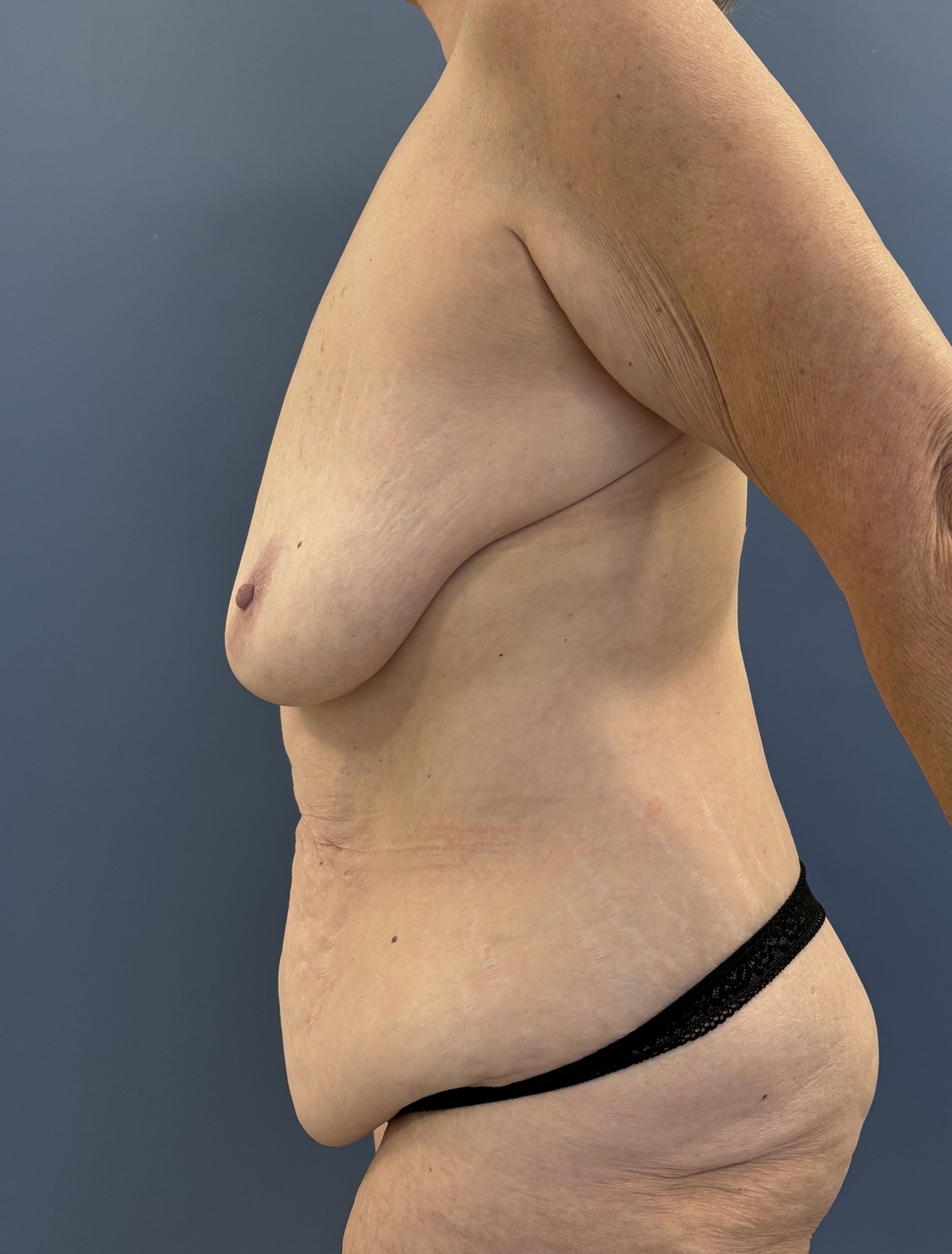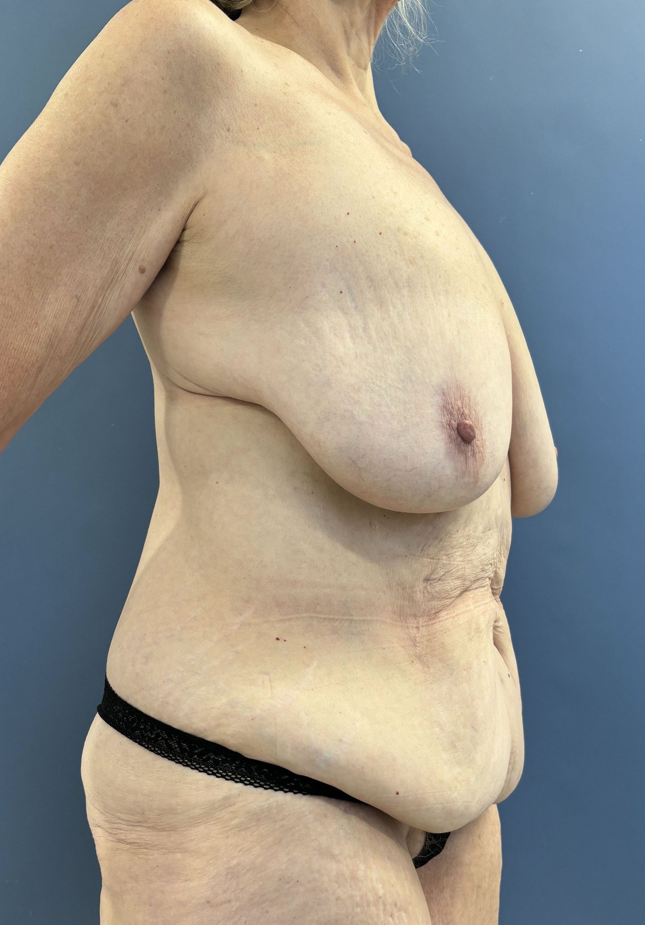 The patient underwent an extended abdominoplasty which started in the back to remove some excess flank skin as well as a full mastopexy without implants. She also had an umbilical hernia repair.