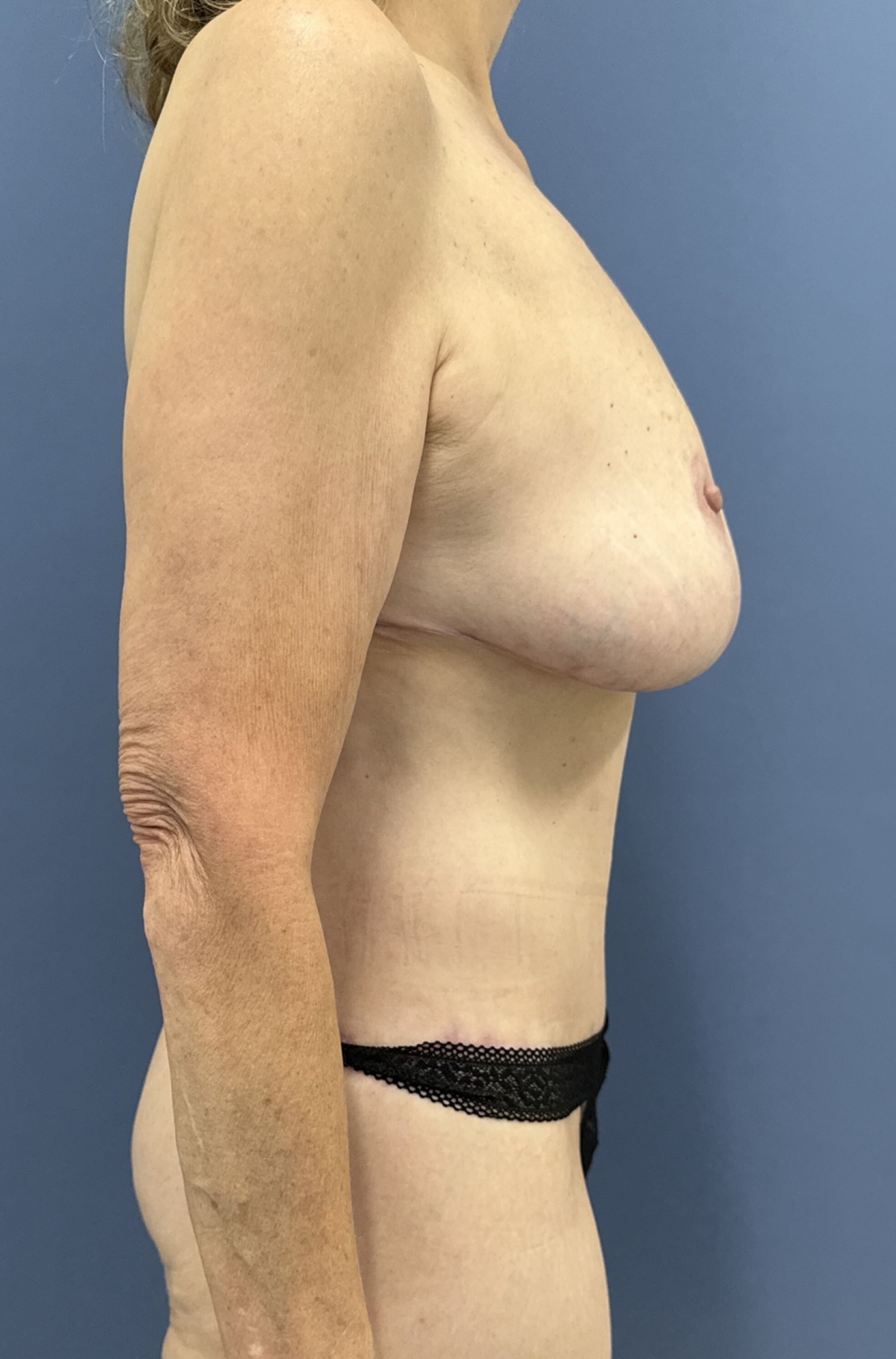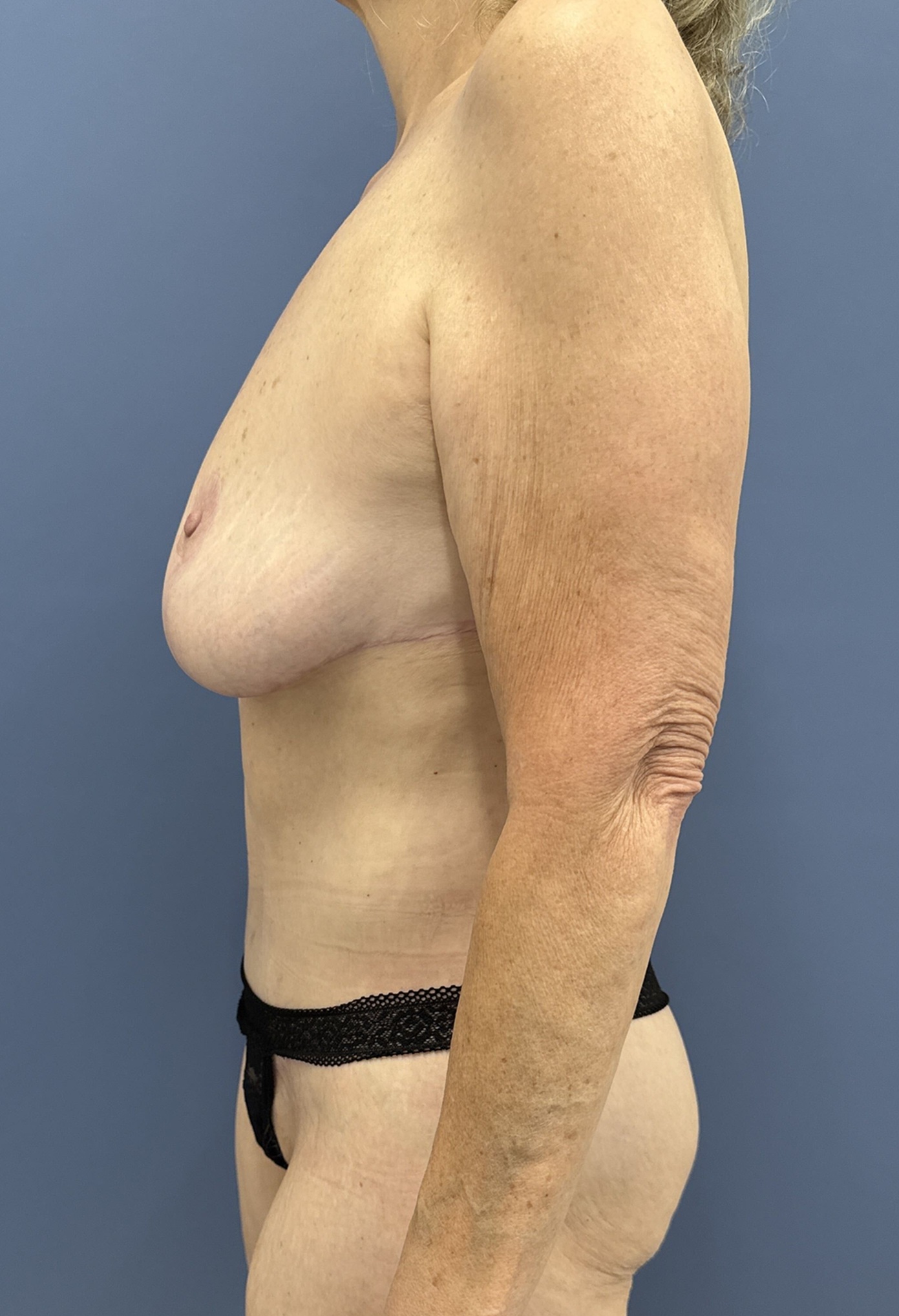 This 57-year-old woman had undergone a bariatric procedure about 10 years ago and has lost over 100 pounds. At one time she weighed 250 pounds. She has some weight fluctuations and recently began a GLP-1 medication to get her weight back down to close to her goal weight. When she presented to Dr. Lyle her body mass index was 26 but she had sagging breasts and loose abdominal tissue which extended into the back.