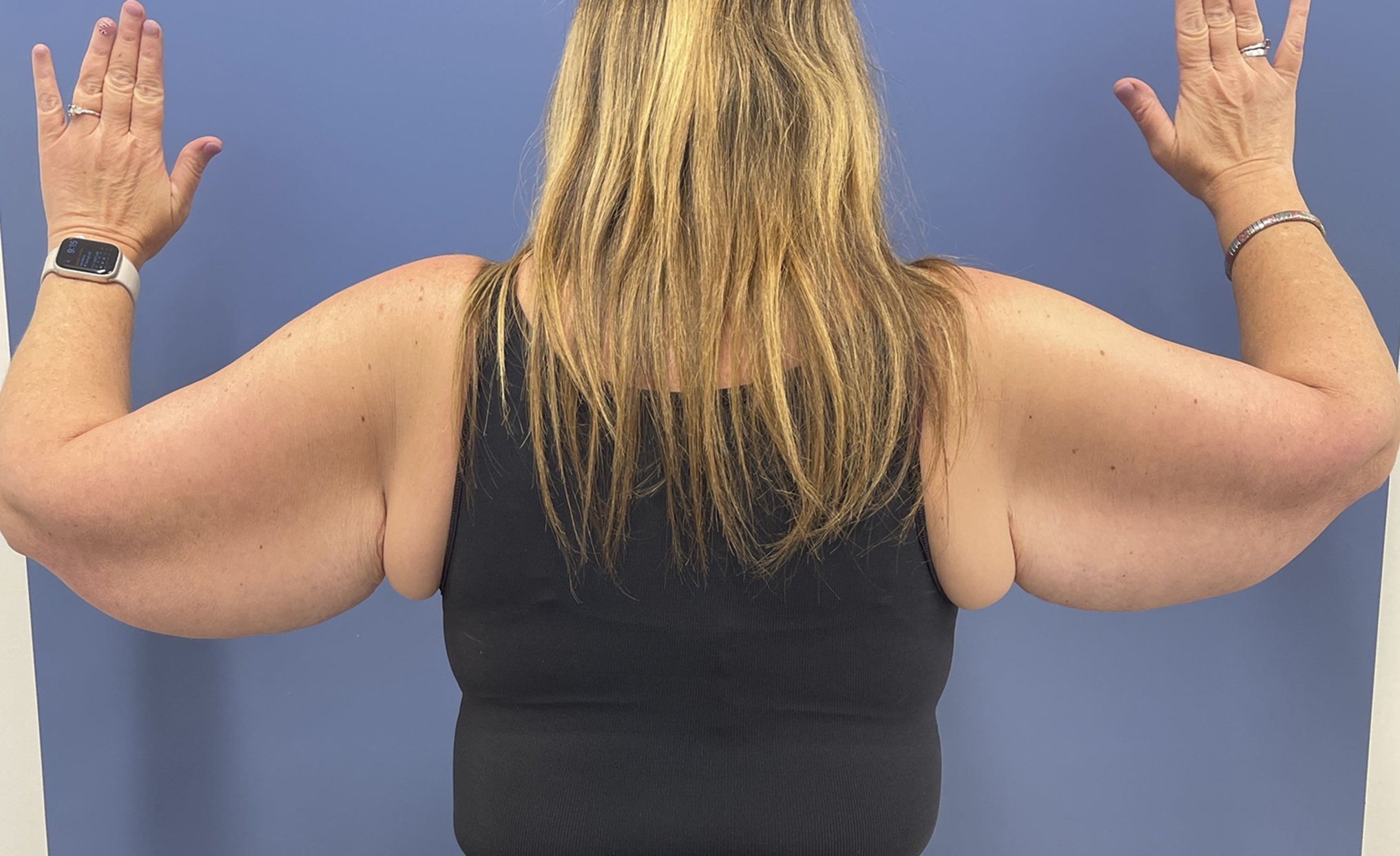 The patient underwent a standard brachioplasty or arm lift. Her recovery was uneventful, wearing Ace wraps on her arms for a week followed up with compression sleeves for 3 months. Her incision was managed with prolonged taping. This helps to reduce scarring which also is helped with scar creams.