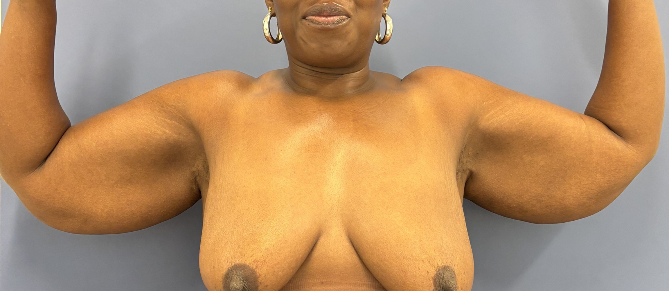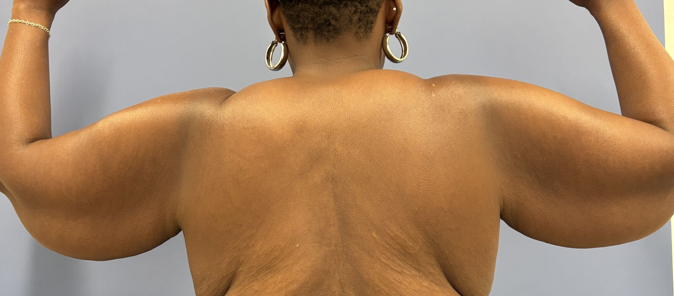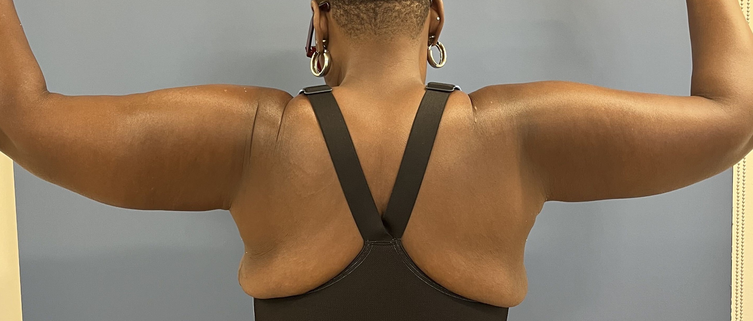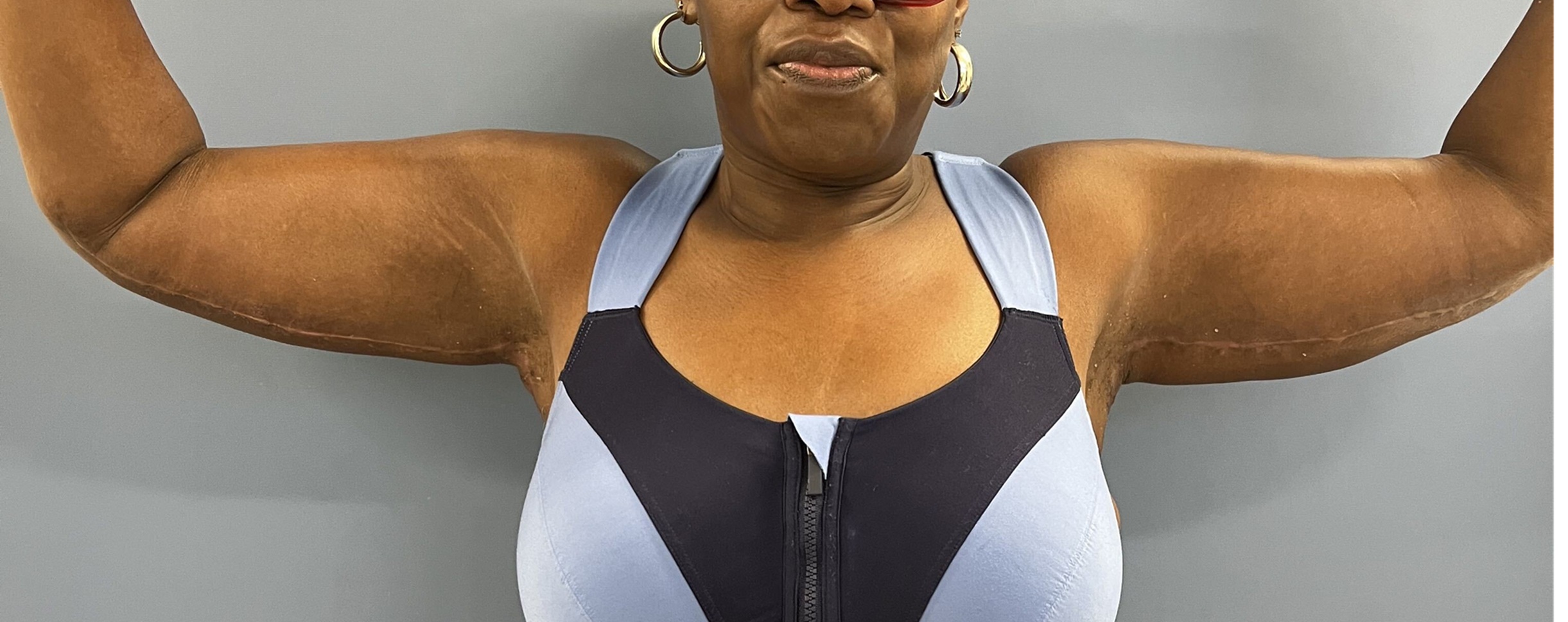 This 47 -year- old woman had lost some weight but had always had large loose arms. She had been working out more- getting healthier and found that she was very self -conscious with her arms- especially when working out in the gym. She had what some call a “batwing” deformity ” where the upper arms are loose and flabby.