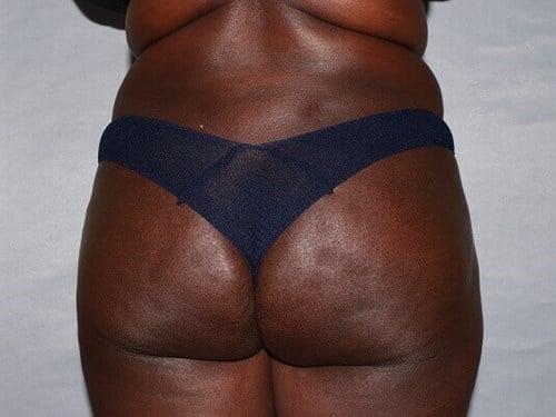 She was not an ideal candidate. For one thing, she had a large overlying pannus or loose skin on her abdomen. She was advised that this appearance would not be made better with liposuction. In fact, with loose skin, liposuction can make things worse on the abdomen. However, she was not too concerned about this. She also had diabetes. Although well controlled, this condition can lead to increased infection rates and potential for less fat graft success due to vascular issues. Nevertheless, she chose to undergo this procedure as she was deemed a moderate risk. This procedure was performed in the hospital as an outpatient owing to her diabetes. She had 3 liters of liposuction performed on her abdomen, flanks, and back. After processing, usable fat was 1500cc, so she had 750 cc of fat placed in each buttock, in the subcutaneous plane only to improve buttock projection.