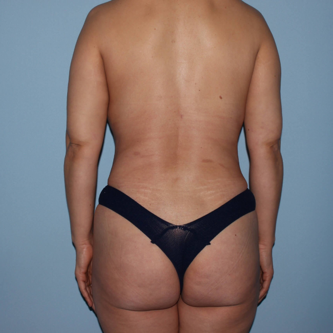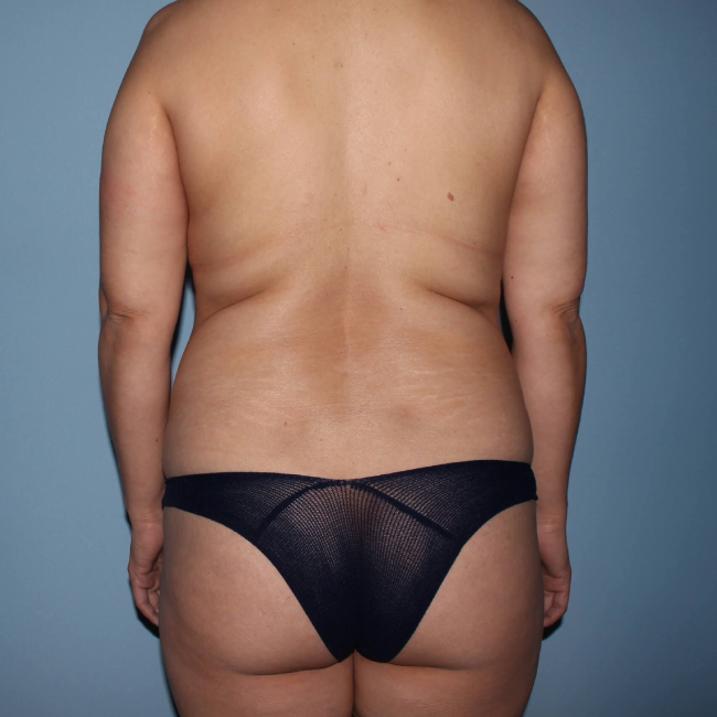 She underwent liposuction of the flank and back with Vaser Emulsification with conservative fat grafting to the buttocks in the prone position, and then was placed supine to complete the procedure, which included augmentation mastopexy with 255 cc silicone breast implants and vertical technique. She then had additional liposuction of the flanks and abdomen with abdominoplasty.