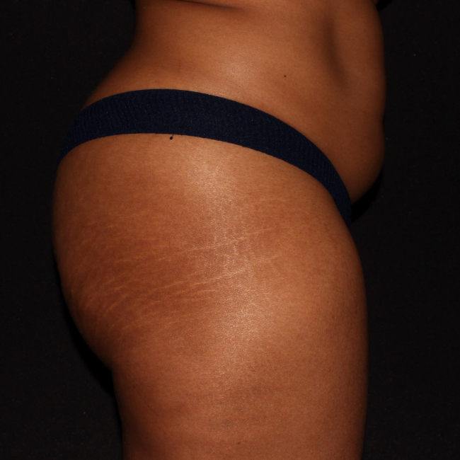 She underwent Vaser-assisted liposuction with PAL (Power Assisted Liposuction) with harvest of over 2700 cc of fat. Vaser is an ultrasonic device that helps break down fat more efficiently and may help shrink the skin a little. After processing and elimination of broken cells and oil, she had approximately 1600 cc of usable fat. She did not want excessively large buttocks, so only 580 cc each was used to augment her buttocks.