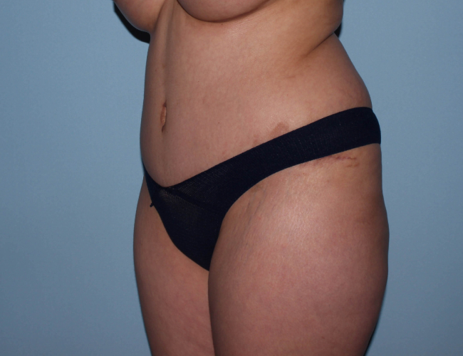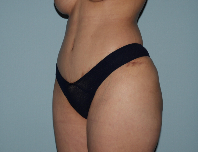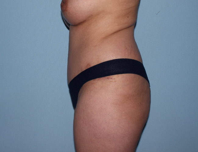 She underwent the implant placement and tummy tuck with some limited liposuction and then underwent further liposuction of the flanks and back with fat transfer to the buttocks 3 months after.