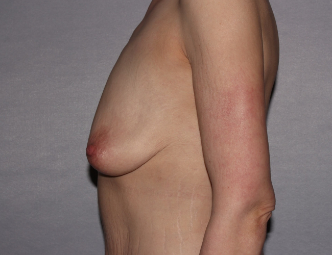 She had an augmentation mastopexy done with a T scar or anchor pattern breast lift with placement of 295 cc moderate profile silicone gel implants. This helped to reshape the breast and restore volume. She also had a lower body lift and thigh lift, as well. Breast lift with implants in post-bariatric patients can be quite challenging, as the soft tissues have lost their strength, and recurrent sagging is often an issue. Reinforcement of the breast lift with the patient’s own tissue through a variety of techniques or even using surgical meshes such as Gala flax or allografts is often recommended to maintain the breast tissue as well as the implant in proper position.