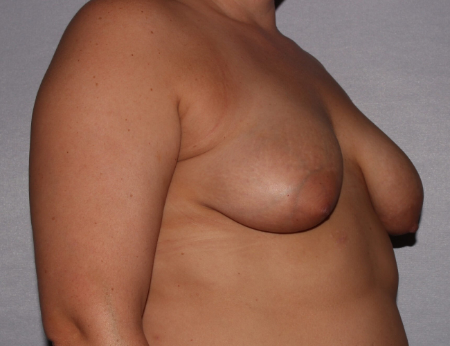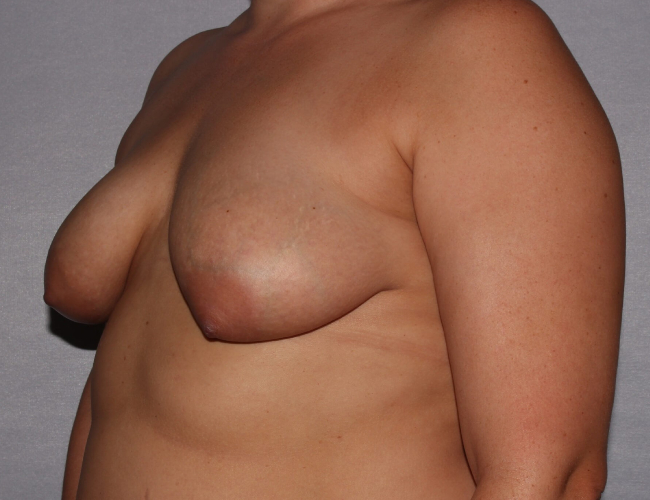 She underwent a vertical breast lift with subpectoral placement of smooth-walled saline implants. This incision, also known as a lollipop-type lift, involves fewer incisions than the standard inverted T scar mastopexy. The left side was a larger breast, so she had a 375 cc Mentor smooth-walled saline implant inflated to 395 cc. The right side was smaller and had a 375 cc implant inflated to 450 cc.