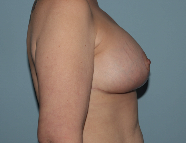 She underwent bilateral augmentation mastopexy with silicone gel implants. Implants were placed under the muscle with a full anchor pattern type mastopexy. She had Allergan S SM 345 cc prosthesis placed with a Keller funnel. Weight loss results in obvious laxity of tissue involving arms, breasts, abdomen and thighs and face. Most weight loss patients have a number of concerns, and the aftereffects of weight loss do not affect people the same way. This patient was not terribly unhappy with her abdomen and prioritized her breasts. Augmentation mastopexy in this patient population usually involves the use of silicone gel implants, which have improved in terms of safety and implant choice selection over the years. Generally, Dr. Lyle prefers placement under the muscle to provide more soft tissue coverage and reduce the risk of capsular contracture.