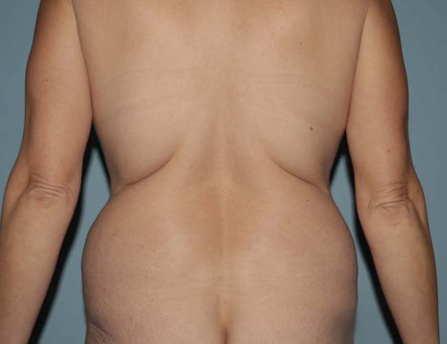 This 47-year-old woman wished to have improvements in her breasts with more fullness in the upper pole, a better shape, but without being too large. She also had concerns about the fat and loose skin of her back and flank areas, and was hopeful to have her breasts treated at the same time as her liposuction.