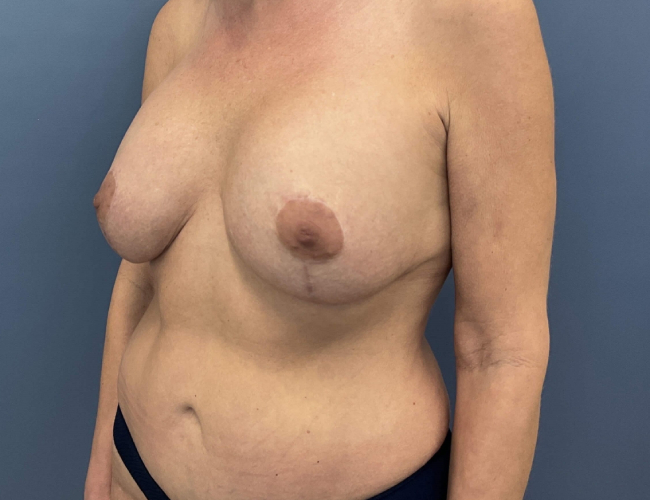 Dr. Lyle performed Vaser-assisted liposuction, which uses ultrasonic energy to shatter the fat prior to removing it with standard power-assisted liposuction. He also used the Renuvion device, which helps to shrink the collagen fibers exposed by the liposuction to help prevent loosening of the skin, which frequently occurs with liposuction. The patient had this performed in addition to an augmentation mastopexy with placement of 325 cc Allergan implants during the mastopexy.