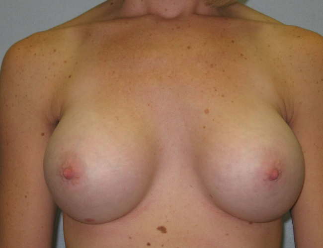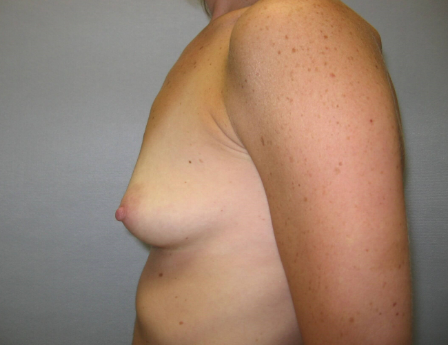 This 25-year-old woman had relatively small breasts, which were accentuated by a mild pectus excavatum deformity, which is a congenital condition with a depression in the sternum in the area between the breasts. She wished to go from an A cup to a C cup and chose saline breast implants.