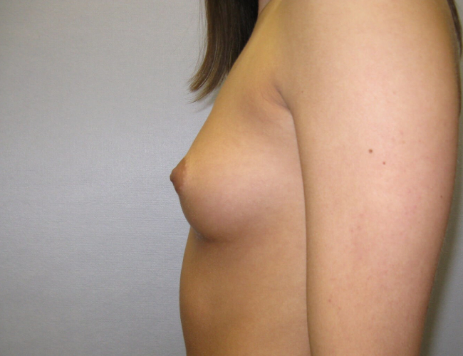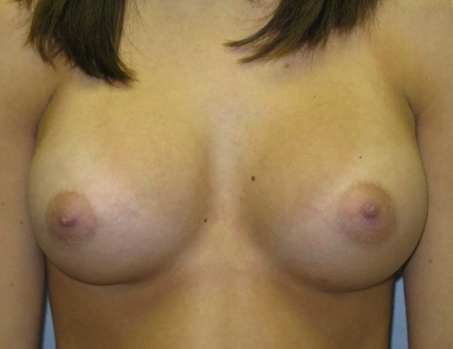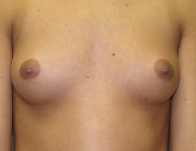 This 18-year-old woman desired breast augmentation. Because she was under 22 years old, saline augmentation was chosen.