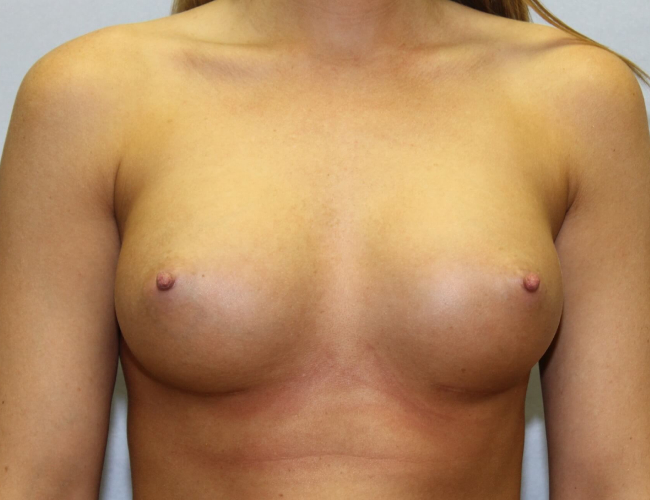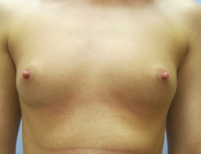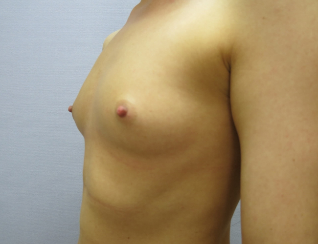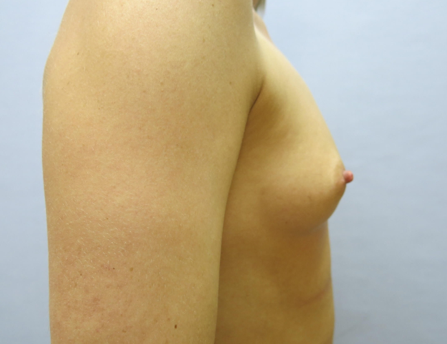 This is a 22-year-old woman who had small, underdeveloped breasts – she wore an A cup. She desired a C cup and wished to have silicone gel breast implants. She was fairly small-framed and had very tight skin on her breasts. She had not had any children yet.