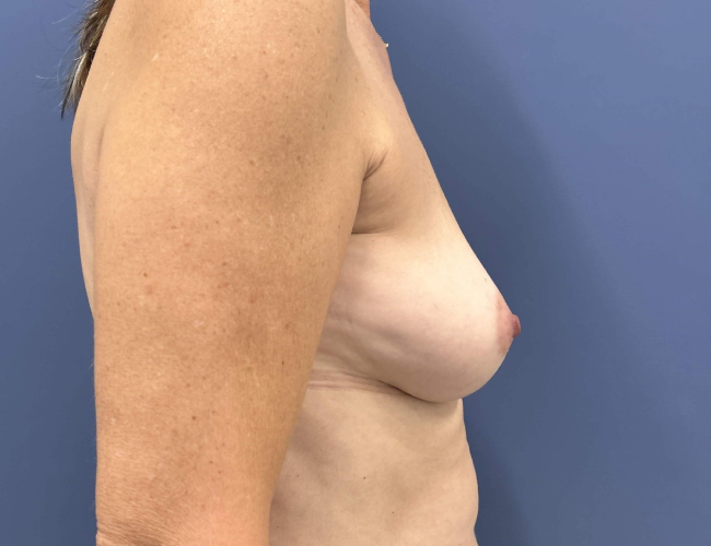 This 57-year-old woman had always desired more fullness in her breasts. She lost volume in her breasts as she aged and wore a B cup, and was hoping to have a full C cup. She actually requested a breast lift, but she did not have significant nipple ptosis, and Dr. Glenn Lyle felt that augmentation alone would help to elevate the nipple position and fill up her upper pole. She did not want to be too large and wished to have a natural appearing breast augmentation.