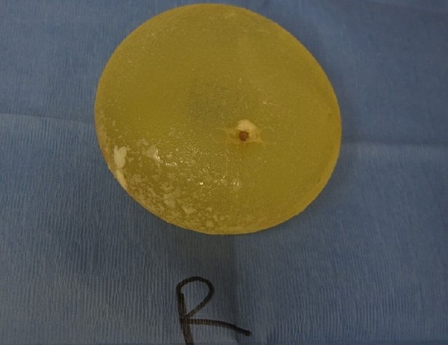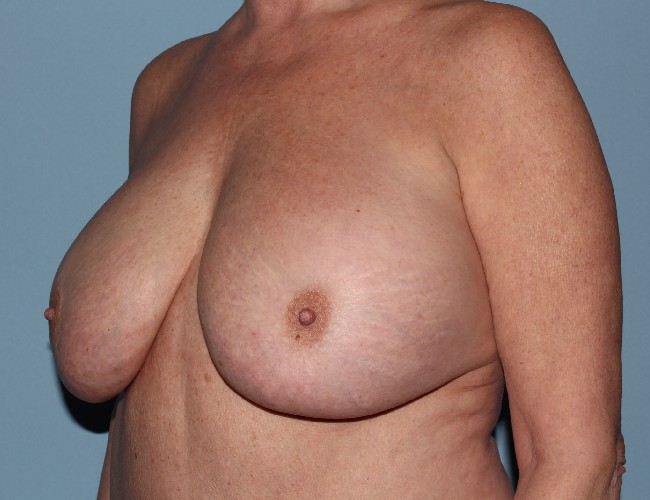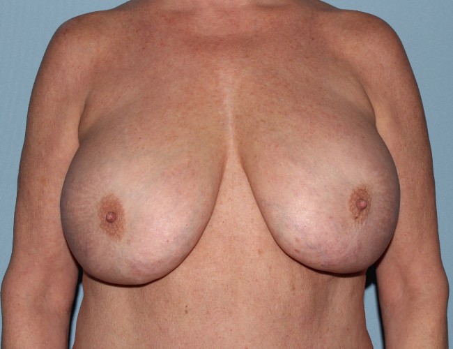 This 53-year-old woman had saline breast implants placed 10 years ago. She has developed some breast drooping and some enlargement of her breasts with aging and no longer desired to be so large. She was not having any significant medical problems related to her implants.