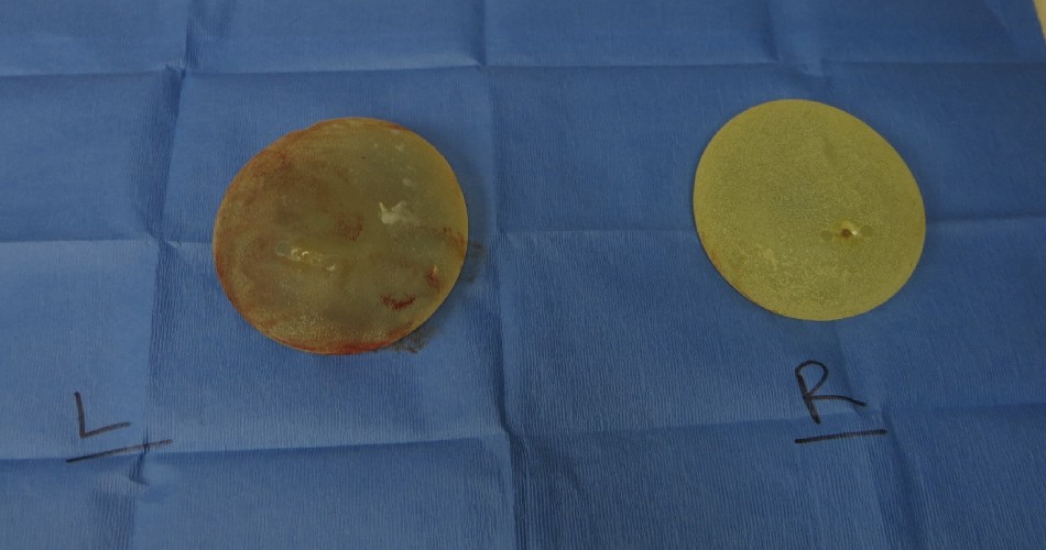 She underwent simultaneous explantation of her breast implants with mastopexy. Her breast implants were found to be McGhan shaped ( or teardrop) textured 320 cc implants. They were both intact and did have capsule present although not thickened. There was no evidence of ALCL clinically.