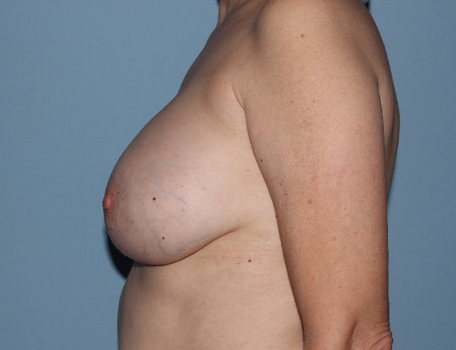 Many women choose to remove their breast implants- typically after 15 or 20 years. In many cases, weight gain and aging have resulted in larger breasts than they desire as well as some degree of droopiness. Removal of the implants alone will certainly achieve a smaller breast but there will be significant breast ptosis in most cases. For this reason explantation with mastopexy is frequently indicated. This 50-year-old woman had her breast implants placed with a periareolar mastopexy Over 14 years ago. She gained about 18 more pounds over the years and despite being relatively pleased with her results at an earlier age had decided she no longer wanted the breast implants and wanted to be smaller. Essentially, explantation would achieve breast reduction but she would need breast lifting to reshape the breasts and elevate the nipple. Her implants were 3 50 cc. Explantation with breast lifting is a more challenging procedure then standard mastopexy or reduction because the blood supply to the nipple potentially has been disturbed with the previous surgery and the space occupied by the implant now is a hollowed out cavity which has to be replaced by the remaining breast tissue. This is technically much more difficult than a standard breast reduction and requires the experience of a seasoned plastic surgeon. The removal of the breast implant with associated capsule will result in more bleeding and often requires the use of a postoperative drainage tube.