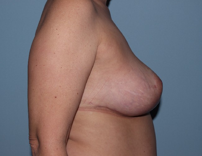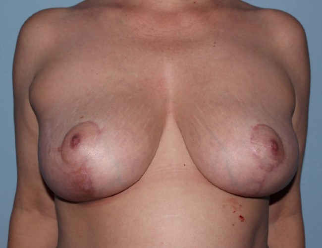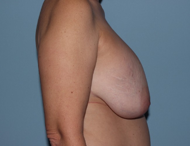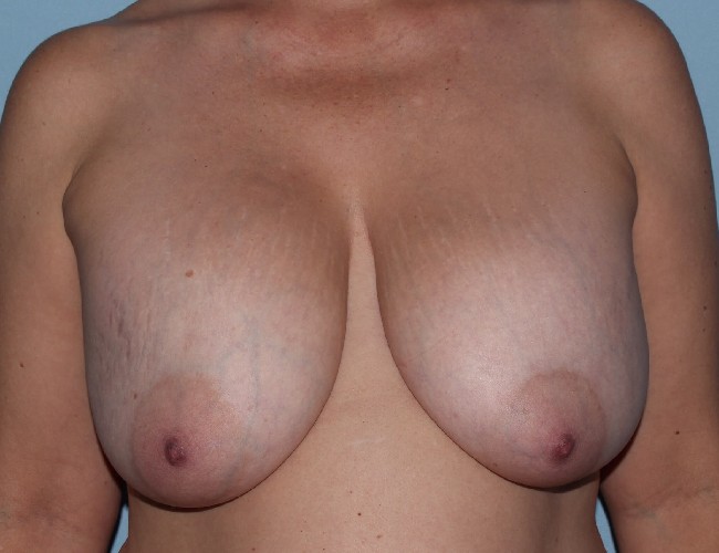 This 52-year-old woman had breast implants placed about 11 years ago with silicone gel implants in the sub muscular position done by another surgeon. She developed some health problems and began gaining weight but was never totally pleased with the appearance of her breasts with the augmentation as she had some degree of ptosis even when the implants were placed. She now felt her breasts are too large and too droopy and desired removal with breast lifting. She had her surgery performed in a hospital setting because of her underlying health issues but still was done as an outpatient. She underwent bilateral removal with total capsulectomy of breast implants. Interestingly, she was found to have an intracapsular rupture of the right breast implant which was unsuspected. The implant material was contained within the capsule and removed with complete capsule removal. She underwent simultaneous mastopexy and was very pleased with the smaller more lifted and perkier-appearing breasts. Motivation for explantation varies depending on the circumstances. Many women, with aging and weight gain, feel that their breasts are too large and develop drooping which can be sometimes accentuated with the extra weight of the implant. Removal with lifting is usually a safe procedure although it can be somewhat complicated if blood supply to the nipple is compromised. It is not unusual to discover unsuspected rupture of breast implants during removal.