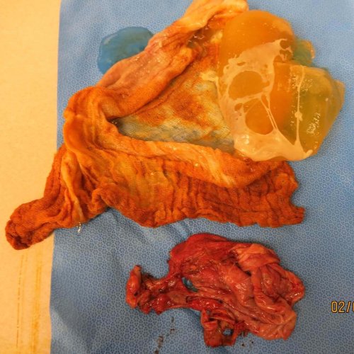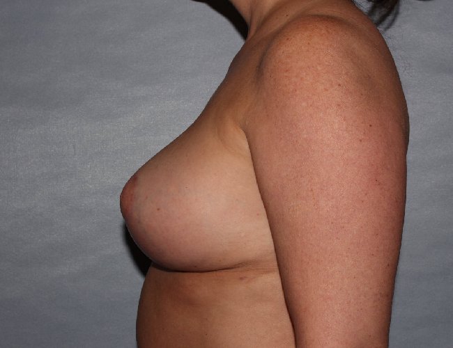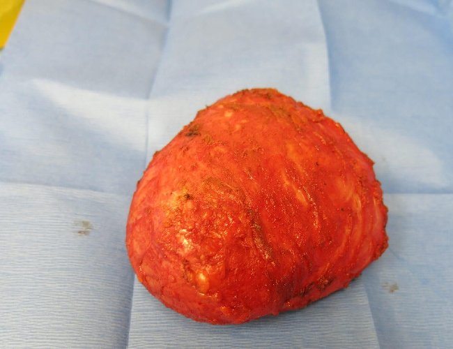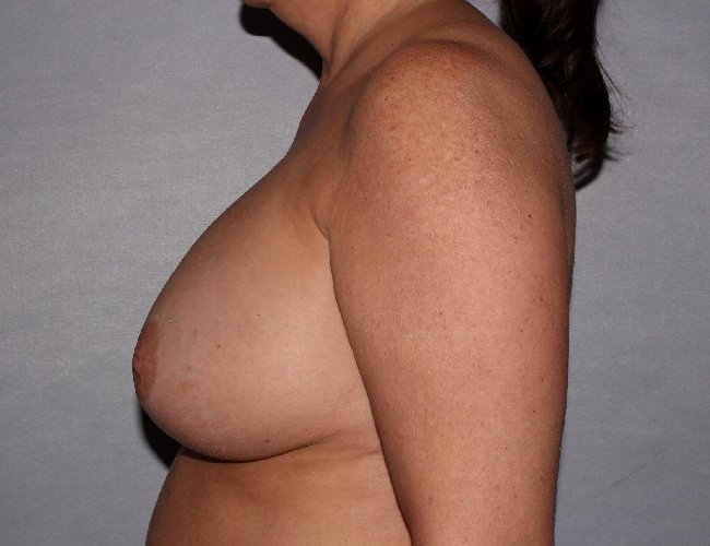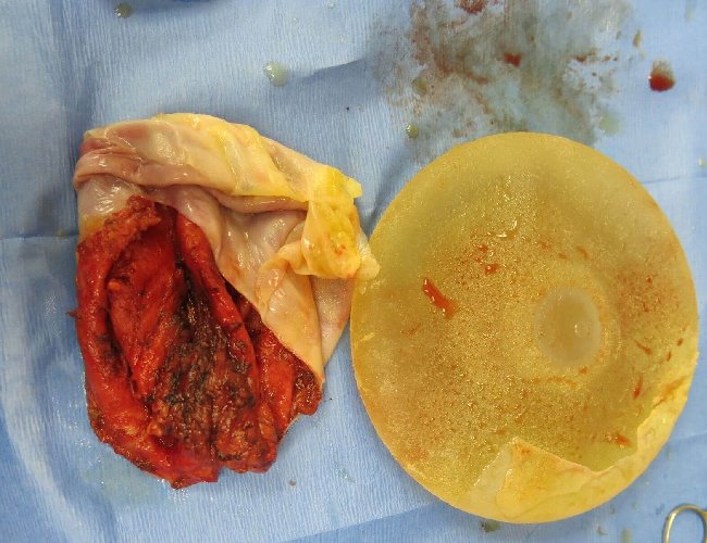 This 48 year old woman had bilateral sub muscular textured implants placed at the time of mastopexy 10 years ago by another plastic surgeon. She developed problems with fluid leakage from her nipples which prompted a mammogram which revealed evidence of disrupted left breast implant. Ultrasound confirmed the finding. The patient wanted the implants removed and replaced. She underwent an en bloc capsulectomy of her right implant. The left side also had en bloc although during the explantation, the silicone was leaking posteriorly and the capsule was adherent to the intercostal interspace ( with lung directly beneath). To avoid chest wall damage, the leaking material was contained with a Betadine soaked surgical pad and the entire capsule and implant material was removed without leakage into the tissues. There was no sign of infection. The patient had smaller smooth walled silicone gel implants replaced. She also had the mastopexy revised. Pathological material was submitted to rule out ALCL. All of this was negative. The patient has done well 3 months post op Textured implants have recently received attention because of a rare association with a form of lymphoma called ALCL ( Anaplastic large Cell Lymphoma). Usually it is associated with a fluid collection around an implant. ( this patient had minimal fluid.- and no pathologic evidence of ALCL). If you have textured implants and having problems, make sure you visit an experienced Board Certified plastic surgeon.