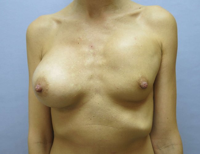 This 33 year old woman had prior transaxillary saline breast augmentation. She developed implant malposition and contracture on the left. She thought the implant was deflated. At surgery, Dr Lyle found a capsular contracture and an intact implant. The patient wanted somewhat larger get implants so her 450 cc saline devices were switched to 550 cc Allergan gel devices with partial capsulectomy. She is now much happier with her breasts.
