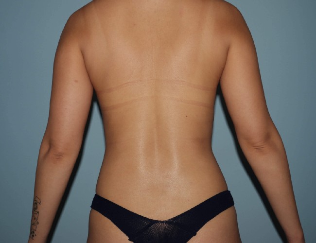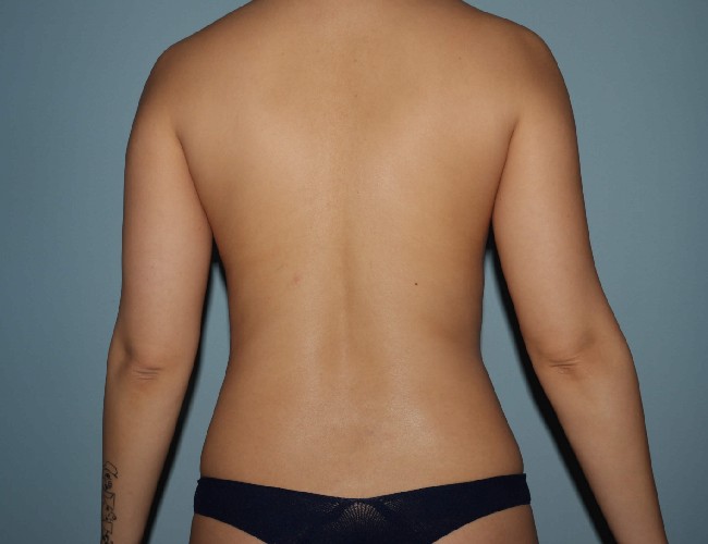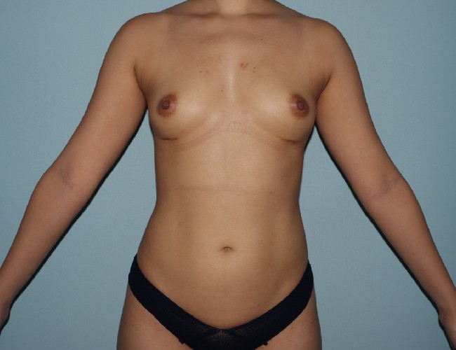 This patient had silicone gel breast implants placed about 11 years ago and was initially satisfied with them but just felt they did not fit her body anymore. She was slender and didn’t feel comfortable. She did not have any problems with the implants . She did not have any capsular contracture or concerns about breast implant illness. She had 300 cc breast implants and was somewhat concerned about the appearance of her breasts after explantation so she chose to have some conservative fat transfer to the breasts. She was hopeful to be smaller after explantation just fearful of looking collapsed after over 10 years with the implants in place. The patient underwent bilateral explantation of her breast implants which were submuscular silicone 300 cc devices. She had Vaser liposuction of the abdomen and flanks with a conservative amount of fat harvested, no more than 800 cc. The fat was processed by washing and removing oil and broken cells with the Pure Graft system. 150 mls of fat was delivered to each breast. This helped to overcome some of the loss of volume and shape but maintained a small breast which was her own natural fat. Fat transfer to the breasts will rarely provide an equivalent result as that of a breast implant and certainly does not allow for a complete volume replacement of the removed implant. It does help after explantation to overcome some anticipated deformities and provide a modest volume improvement.