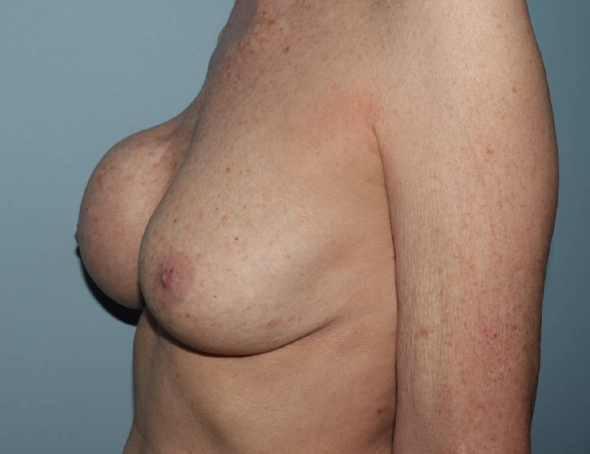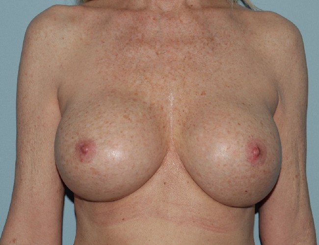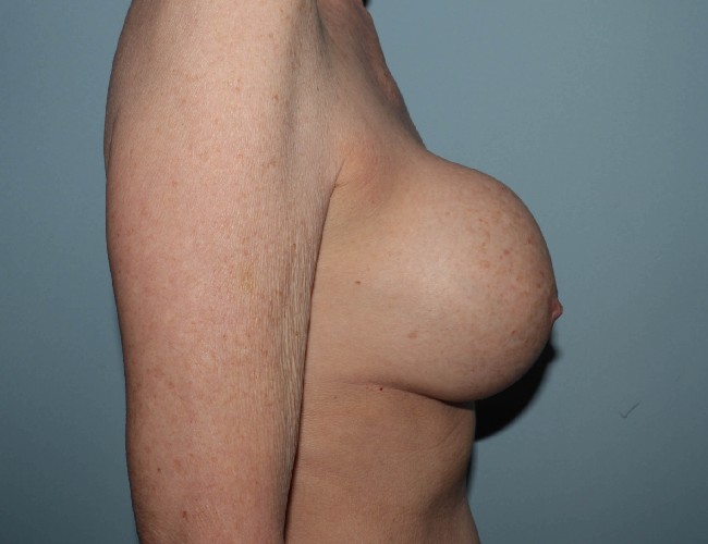 The majority of patients with breast augmentation ultimately will require some sort of reoperation . Breast implants are not lifetime devices and have predictable failure rates. Breast implant leakage, capsular contracture, and implant malposition all can lead to revisional surgery. This 53 -year-old woman presented to Dr. Lyle with concerns about her deflated left breast implant. She also had questions about her intact right implant. Over 22 years ago she had saline breast implants placed on top of the muscle by another physician. She recently developed a leak which was notable by an immediate deflation of her left breast. She was noted to have significant capsular contracture of her intact right breast implant which was quite firm had a globular appearance and was uncomfortable. She wished to maintain nice full volume so was very interested in implant exchange and in fact chose to have silicone gel breast implants. She was found to have bilateral capsular contracture with calcified capsules but no evidence of cancer or any other problems. Because of her thin tissue and because of her capsular contracture she had what is known as a site change from the sub glandular position to the sub muscular position. This is performed to reduce risk of future capsular contracture. She had 450 cc breast implants originally and they were replaced with 490 cc Mentor gel implants. She recovered very nicely and is very pleased with her soft natural appearing breasts.