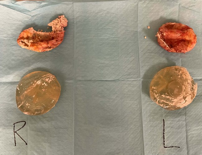 This 60-year-old woman had breast implants placed 35 years ago and over the years had developed hardening and distortion of her breast implants. She had no information about the implant type.