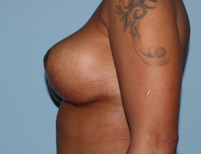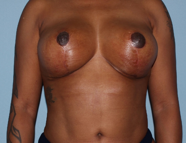 With this in mind, she underwent a small breast reduction or breast lift. She did have removal of more tissue on the left side than the right because of asymmetry, and only had about 300 g of tissue removed.