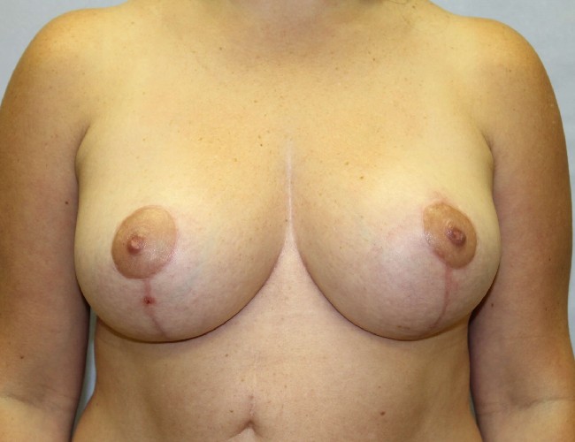 This 37-year-old woman was unhappy with her pendulous droopy breasts. She wanted to maintain a full cup size but lifted and a small reduction. She also wanted to minimize scarring.