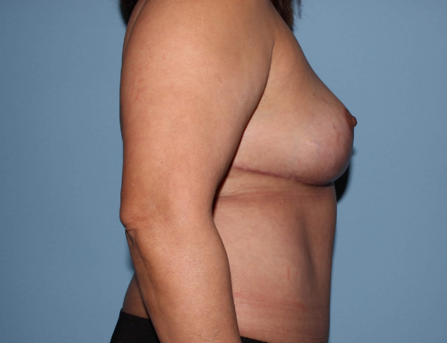 After suitable recovery, the patient has had dramatic improvement in her appearance with smaller, lifted breasts and a flatter abdomen and flank area. Revision breast reduction is a frequently requested procedure. It requires significant surgical experience to avoid complications. Blood supply to the nipple areolar complex has been changed, and careful surgical technique is necessary to avoid loss of nipple or compromise of blood supply. Women are quite satisfied with the further reduction of breast size and improved shape afforded by this procedure.