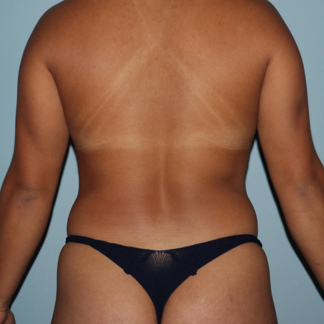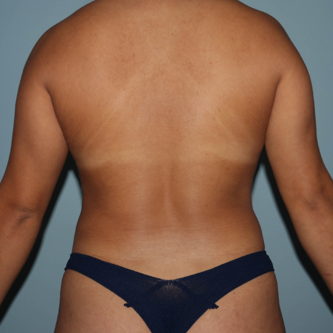 She underwent liposuction of the abdomen and flanks and transfer of some fat to both breasts, but more on the right, which was somewhat smaller. She had a peri-areolar mastopexy on the left side to improve symmetry. A peri-areolar mastopexy restricts the scarring to the areola only, with no vertical or horizontal scars on the breast skin. It has limited utility for minor degrees of asymmetry. It is useful for improving areola symmetry with a slight lifting effect. Fat transfer to the breasts is a useful technique; however, it rarely provides the same sort of results that breast augmentation would. Fat has to be delivered throughout the breast rather than in 1 location as a breast implant does. Overly aggressive fat transfer can lead to complications such as oil cysts, fat necrosis, abnormal calcifications, and abnormal mammograms, so specialized techniques are necessary to limit these potential problems. This patient had approximately 300 cc delivered to the right breast and 170 cc to the left breast to obtain better symmetry. There is some expected resorption of the fat transferred to the breast, and it appears to be even more variable than the fat viability expected with fat transfer to the buttock.