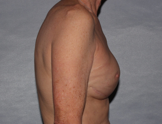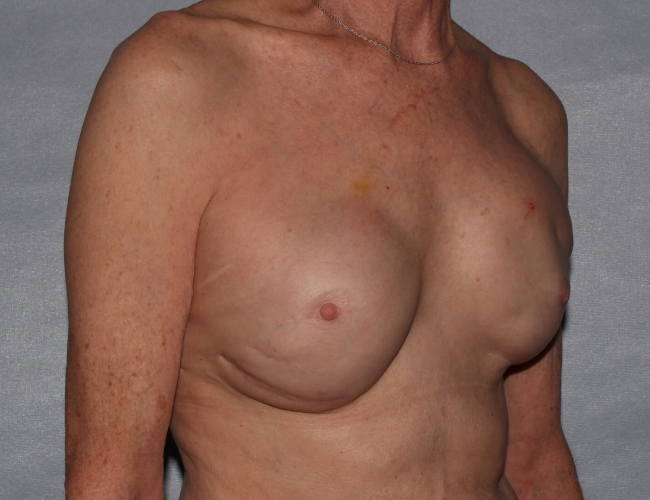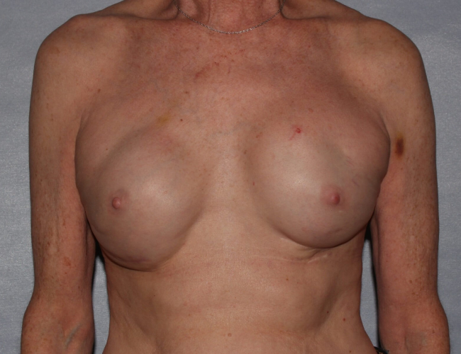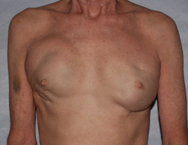 This 60 woman had prophylactic mastectomies performed when she was in her 20s with placement of a silicone gel breast implant. About 20 years later, the implant ruptured, and she had a replacement by another plastic surgeon with saline breast implants. She developed a painful contracture on the right breast and was unhappy with the appearance.