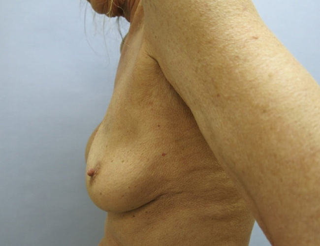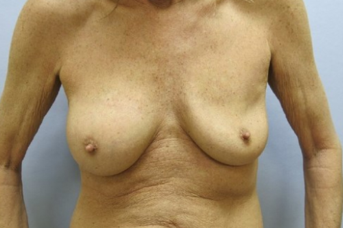 This 59-year-old woman had bilateral saline implants that had been in for over 10 years. She developed a deflated appearing left breast suddenly one day without any trauma. The sudden leakage of her breast implant was alarming but not painful.
