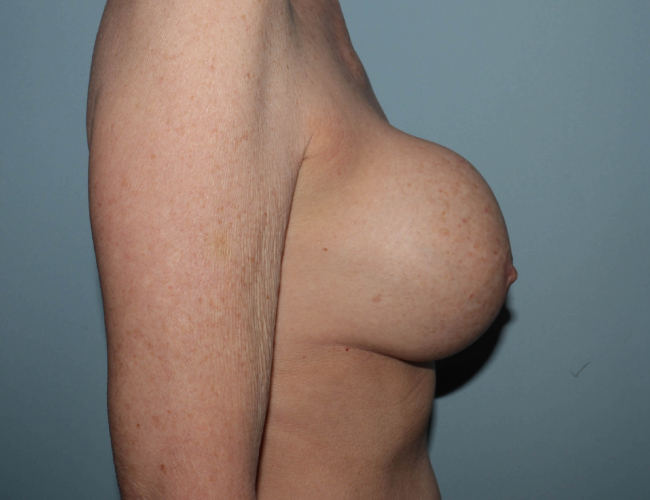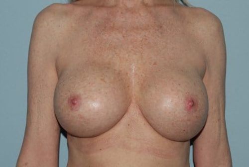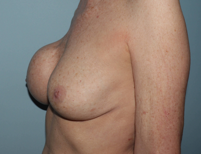 Because of her thin tissue and because of her capsular contracture, she had what is known as a site change from the subglandular position to the submuscular position. This is performed to reduce the risk of future capsular contracture. She had 450 cc breast implants originally, and they were replaced with 490 cc Mentor gel implants.