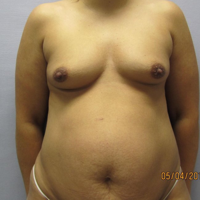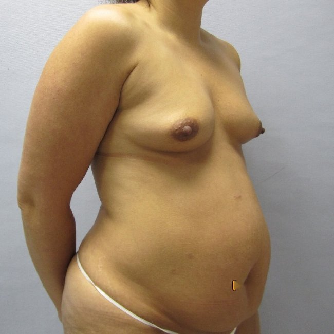 This 31-year-old woman suffered from significant diastasis recti or a stretching of the abdominal wall after 3 pregnancies, including 2 C-sections. After her third pregnancy, she stated that she often still looked pregnant because of the potbelly appearance. She was noted to have a very significant diastasis. She also desired the reinflation of her breasts after she lost volume after pregnancies. She chose saline breast implants.