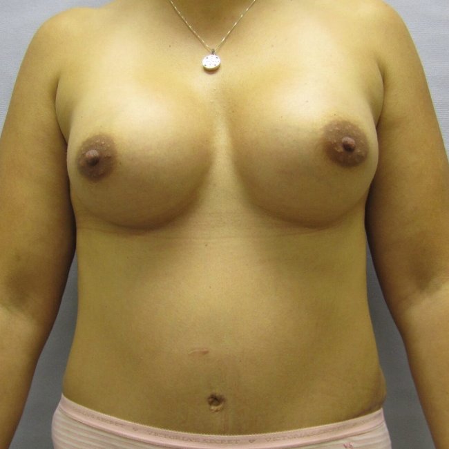 During her surgery, she underwent repair of a very significant diastasis, which was done by plication technique involving tightening the loose fascia covering of the abdominal muscles. This was performed during her abdominoplasty. In her case, her breast augmentation was performed through the abdominal incision without making incisions on her breasts. Submuscular placement was achieved. There was a time when trans-umbilical breast augmentation was popular, but it was typically only done with saline implants. This patient did not have that procedure, but her abdominal incision was utilized to place her saline breast implants. The added benefit was fewer scars.