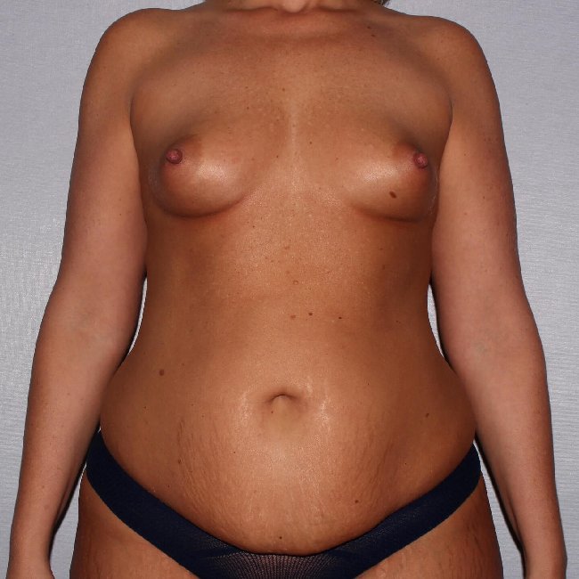 The patient underwent abdominoplasty with some liposuction of her flanks and diastases repair. She underwent bilateral breast augmentation with 475 cc Ideal breast implants.