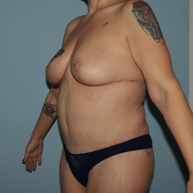 She underwent bilateral mastopexy with abdominoplasty and some liposuction of the flanks. A somewhat more conservative approach was carried out because of her history of smoking and diabetes. Bariatric patients frequently have an extensive blood supply with residual enlargement of vascular supply to the skin, based on when they were obese; however, caution is still necessary.