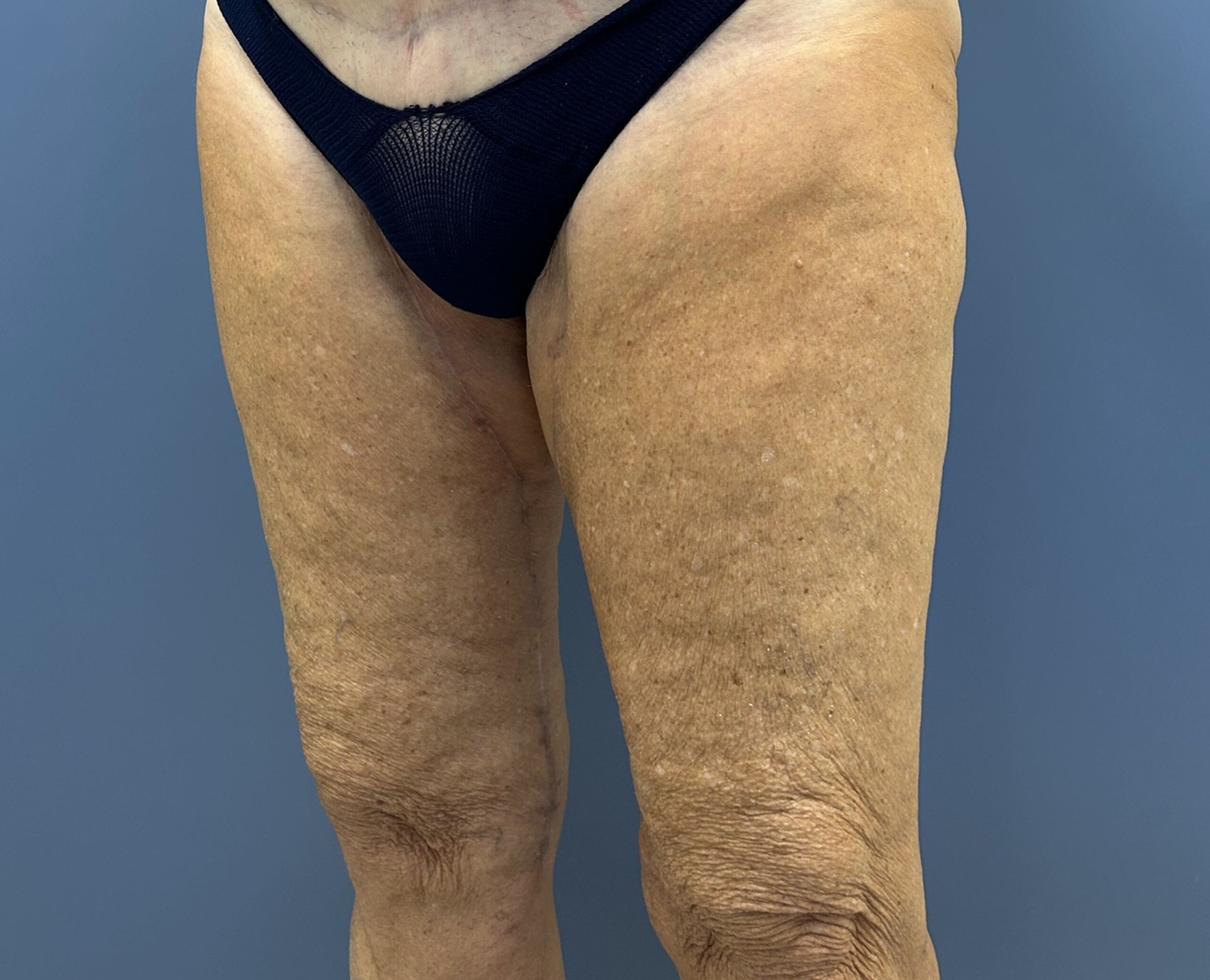 This 77-year-old woman had a new lease on life as she has lost a considerable amount of weight and was enjoying her retired lifestyle looking at the beach. She was very self-conscious about the loose skin on her arms breasts and thighs. She had a breast lift and brachioplasty as well as a revision of abdominoplasty done by another doctor. She was very pleased, and her final step was to improve the appearance of her thighs which were very loose.