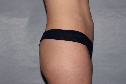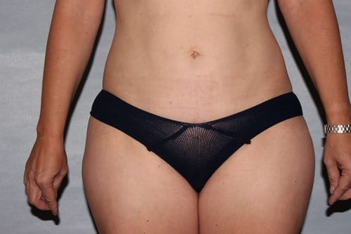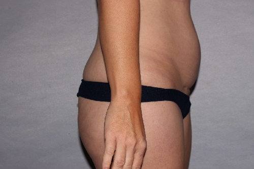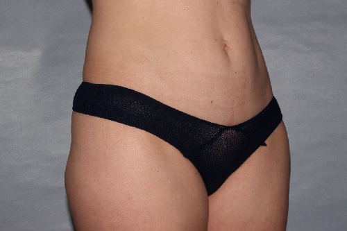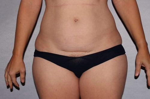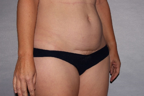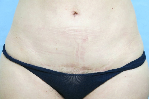 This 43-year-old woman had two C sections in the past. She maintained a good diet and exercise program but was unhappy with her lower abdominal appearance. The C section scar was tethered and with aging and some weight gain- she developed a shelf like appearance that could not be hidden with a 2 piece bathing suit and was noticeable in tight fitting dresses and workout clothes.