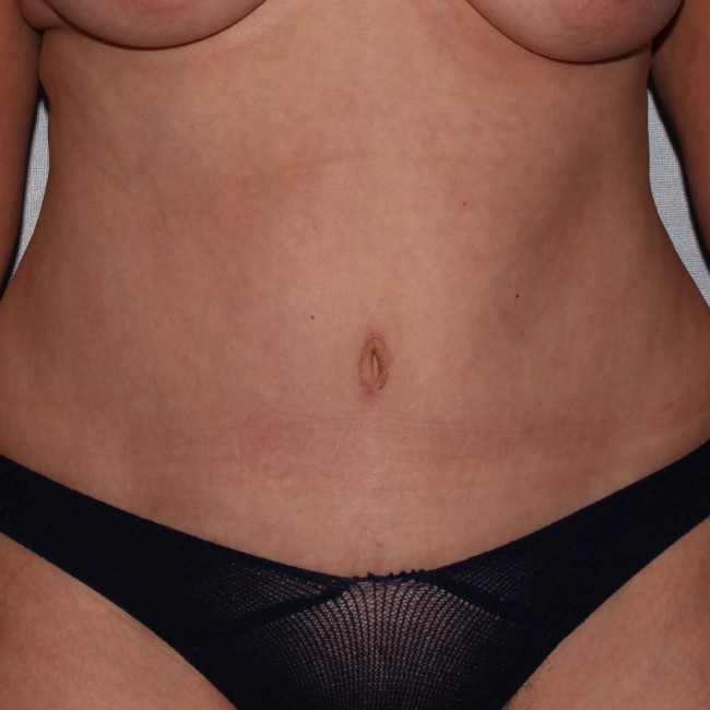 She underwent a full abdominoplasty which removed the scar and excess skin and fat from her lower abdomen and tightened her abdominal wall via rectus plication.