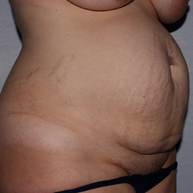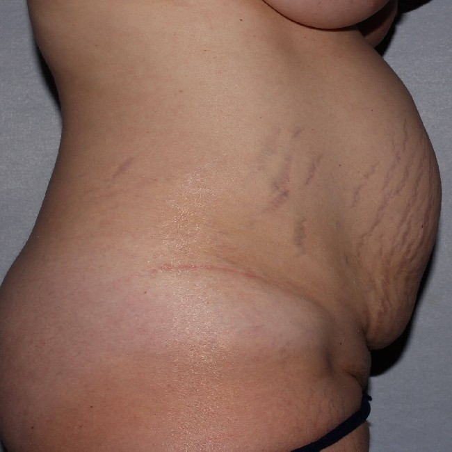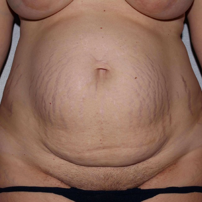 This 36 year old woman had two large babies delivered by C section. She had significant stretch marks ( also called striae) as well as a wide diastasis recti ( stretching of the fascia that holds the rectus abdominus muscles together). She also had a small hernia just above the belly button where the diastasis was largest. She had a C section scar which accentuated the overhang of her excess skin. She desired correction of these conditions.